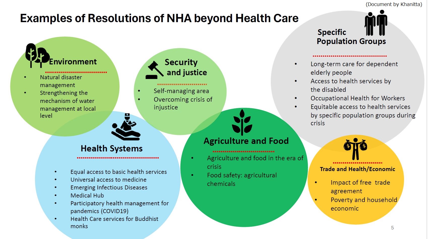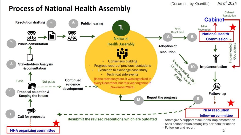 - & 9. The adoption of resolution: Sent to the National Health Commission, then proposed to the Cabinet. The resolutions adopted in the National HA are not only about healthcare (e.g., healthcare services for Buddhist monks) but also cover social and environmental issues (e.g., strengthening local mechanisms for water resource management, food safety).