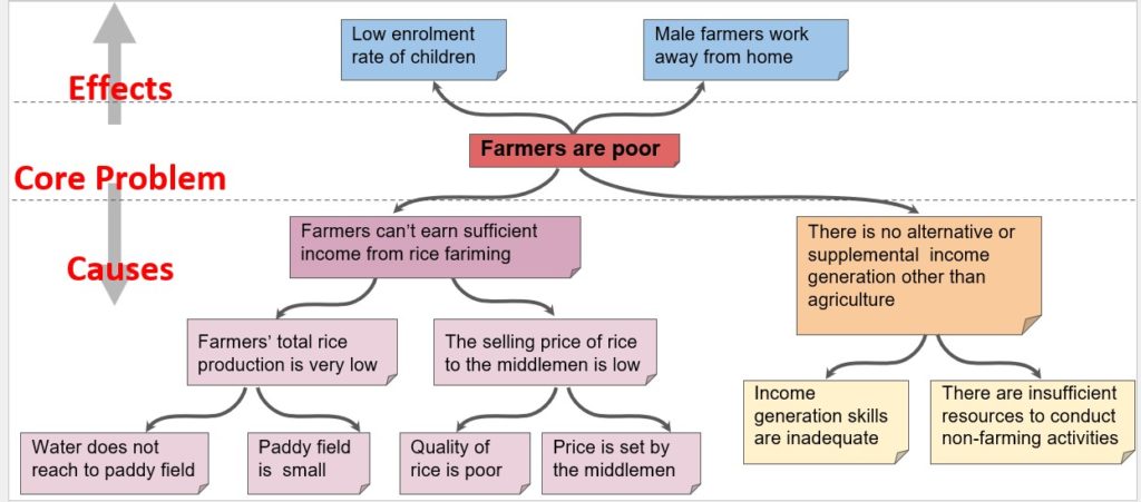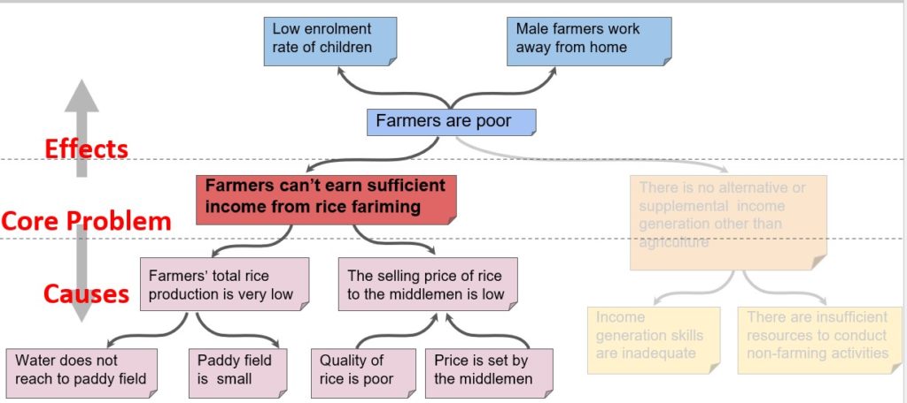 Yayoi mentioned that the selection of the core problem should consider the capacity of the implementing agencies, the availability of supporting groups, and the funding agencies. In the sample case, if the implementing agencies and supporting groups are an expert in agricultural areas and lacks the capacity to promote alternative income generation outside of agriculture, the core problem should be focused on agriculture as follows. Yayoi said that it is acceptable to start the analysis with a tentative core problem. During the analysis process, the ideal core problem will naturally be revealed.